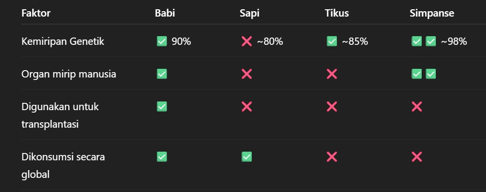 Karena kemiripan genetik babi dengan manusia sangat tinggi. Beberapa protein mereka sangat menyerupai protein vital manusia — seperti pada pankreas, saraf, bahkan otak.