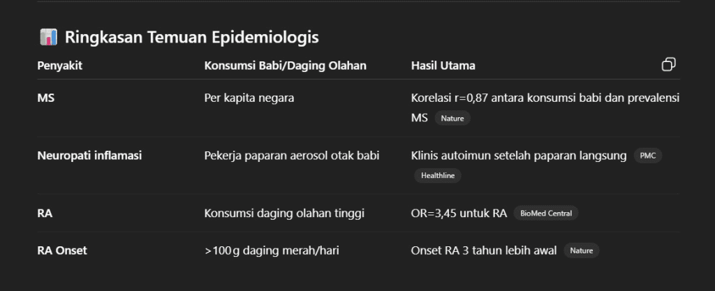 - Data ini memperkuat logika bahwa protein babi mirip manusia → risiko mimikri molekuler → risiko autoimun tinggi.
